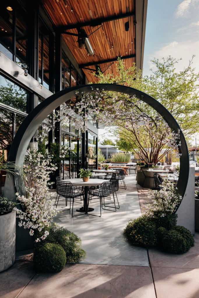 This arch features a bold circular metal frame softened with delicate spring blossoms and trailing greenery. Light pink and white florals climb gently around the lower curve, paired with fresh foliage that keeps the look airy and natural. Set at the entrance of a modern patio with clean lines, wood ceilings, and open seating, the arch feels perfectly integrated into the space rather than placed on top of it.