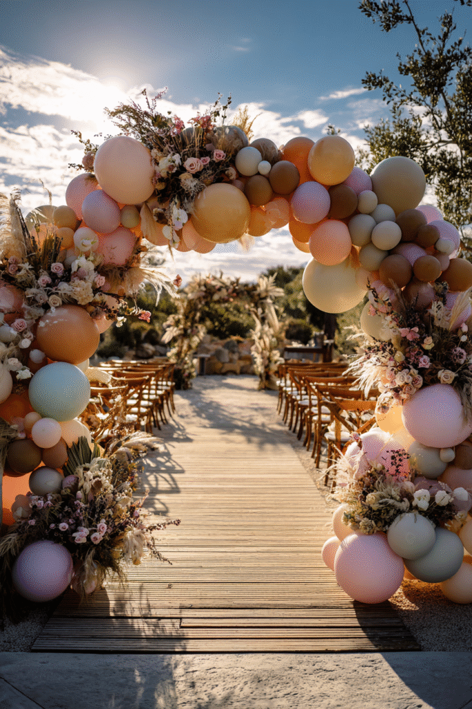 This arch is built entirely from soft pastel balloons in shades of blush pink, warm peach, muted lavender, and creamy beige, arranged into a full rounded shape. Small floral clusters and dried accents are tucked throughout the balloons to add texture and a touch of spring romance. Placed at the start of a wooden aisle with rows of chairs leading toward the ceremony space, the arch feels playful yet thoughtfully styled against the open sky and greenery.