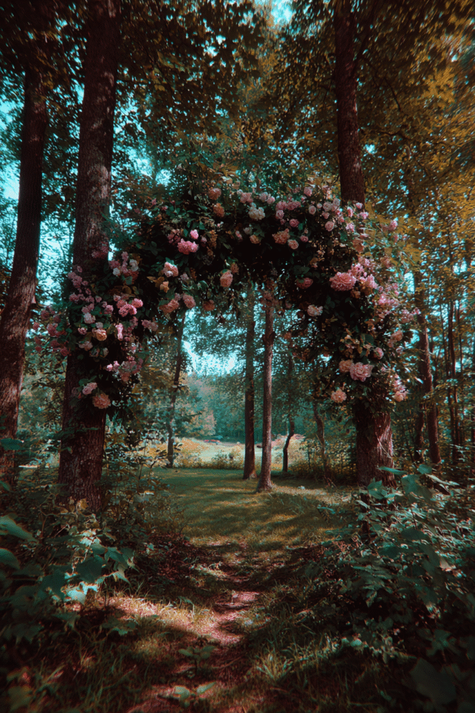 This arch is shaped into a soft rounded curve and fully covered in blush pink roses and delicate greenery. Layers of garden roses, small blooms, and leafy branches create a lush frame that feels natural and romantic. Set among tall trees with warm light filtering through, the arch blends beautifully into the woodland setting while still feeling special and intentional.