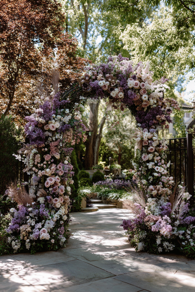 This arch is overflowing with soft lilac blooms, blush roses, creamy florals, and airy greenery, creating a full curved shape that feels completely wrapped in flowers. The base is grounded with generous floral clusters and wispy dried grasses, while the arch itself frames a peaceful garden walkway surrounded by trees and dappled sunlight. Every inch feels layered and intentional without looking stiff or overly polished.
