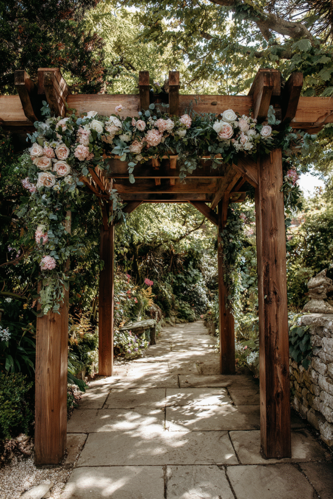 This wooden pergola arch features warm natural beams wrapped in soft greenery and blush toned florals. Pale roses and delicate filler flowers trail across the top and down the sides, blending beautifully with eucalyptus leaves and garden textures. The stone pathway beneath and lush greenery around it make the whole setting feel inviting and serene.