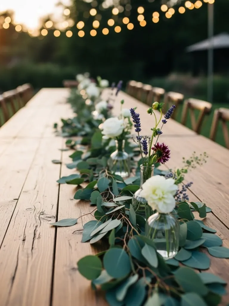 A long wooden reception table is styled with a flowing greenery runner made from eucalyptus and soft white blooms. The leaves spill naturally down the center, paired with simple wooden chairs and warm string lights glowing softly above. The overall look feels relaxed and organic, like an intimate garden dinner under the evening sky.