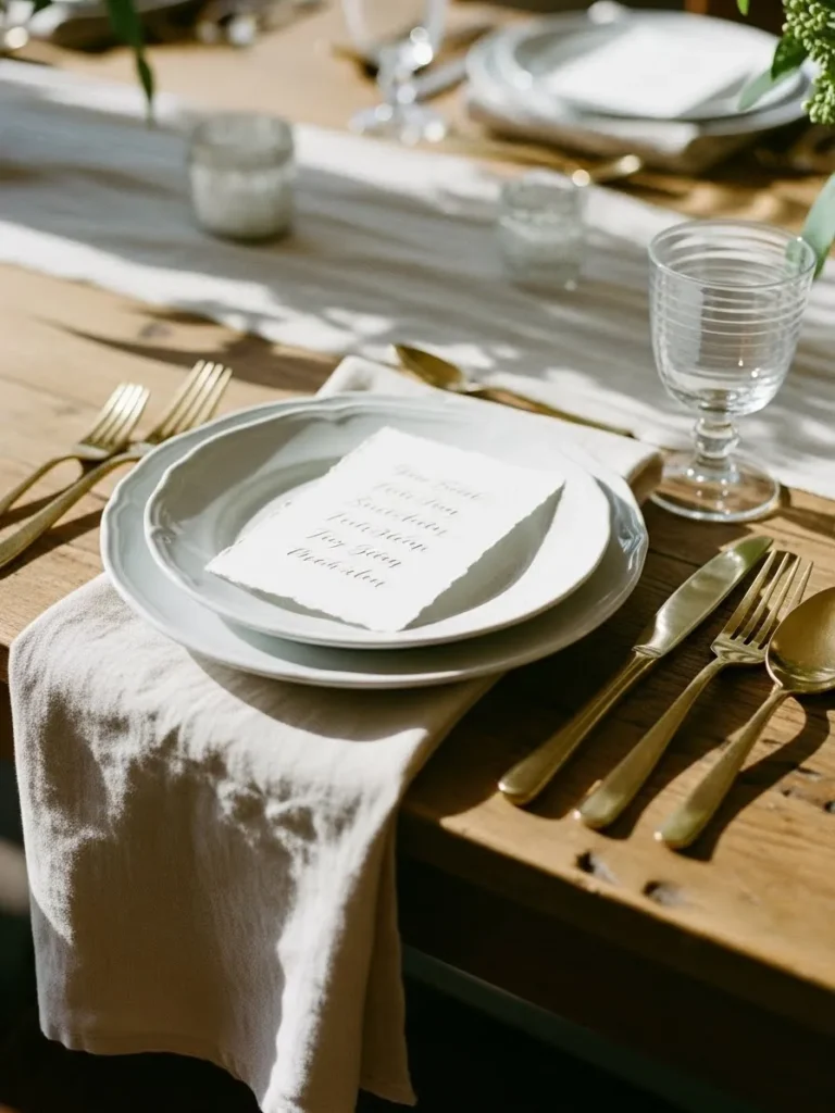 Each place setting features soft linen napkins layered over simple plates with understated paper menus. The neutral tones and gentle folds create a relaxed yet elegant look. Natural light highlights the textures and keeps the table feeling warm and inviting.