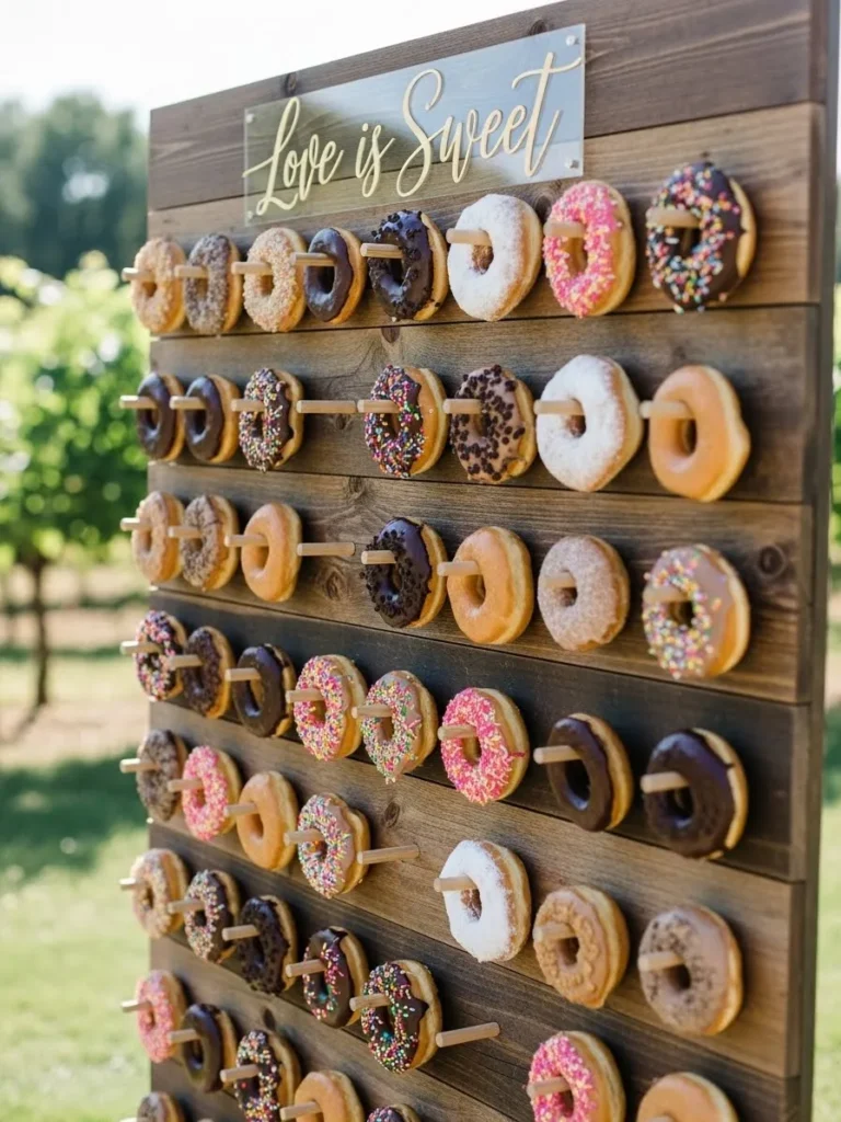 A wooden donut wall displays an assortment of colorful frosted donuts arranged neatly in rows. A simple sign at the top adds a fun and casual vibe. The outdoor greenery behind it makes the colors pop even more.