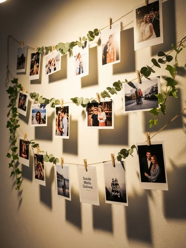 A wall is styled with strings of greenery and clipped photographs that showcase meaningful moments. The photos are arranged in soft rows, mixing candid snapshots with handwritten notes. Natural light and trailing leaves give the display a warm and personal feel.