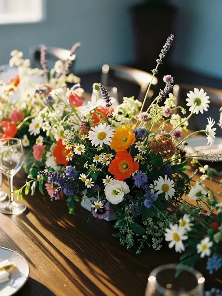 A lush centerpiece filled with colorful wildflowers stretches across a wooden table. Daisies, small blooms, and fresh greenery create a relaxed garden look that feels joyful and organic. The colors pop beautifully against the natural wood.