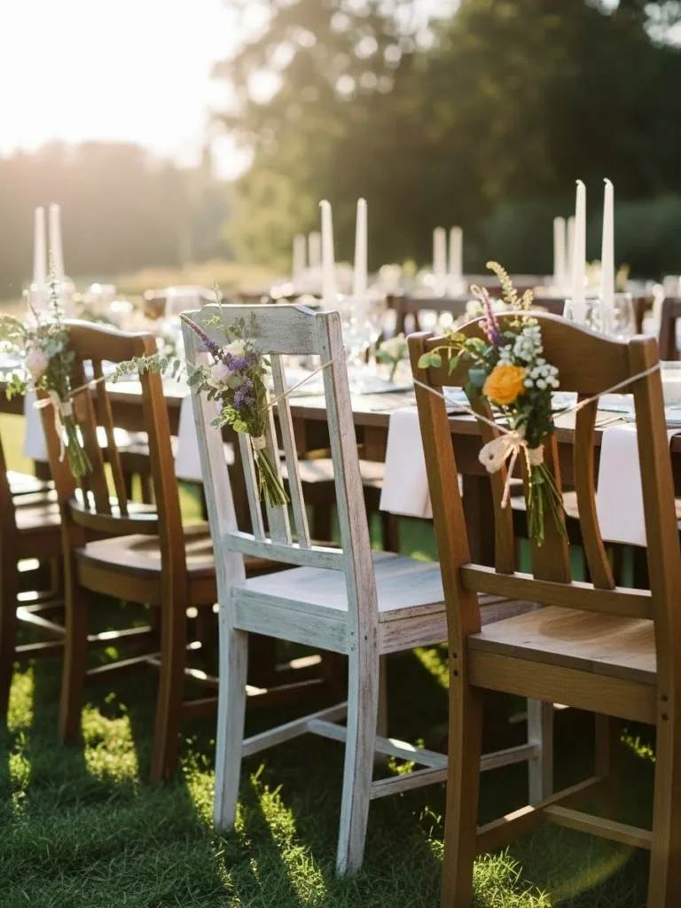 Wooden chairs are arranged neatly on the grass with simple floral accents tied to the backs. The sunlight filters through the trees and highlights the natural textures. Everything feels calm and beautifully grounded in nature.
