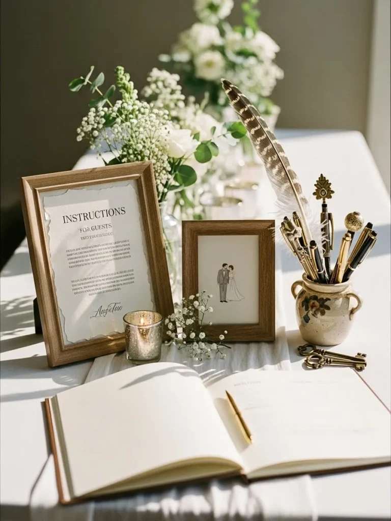 A small table features a framed sign, a guestbook, and elegant writing details. Soft florals and greenery add charm without overwhelming the space. The setup feels inviting and easy to approach.