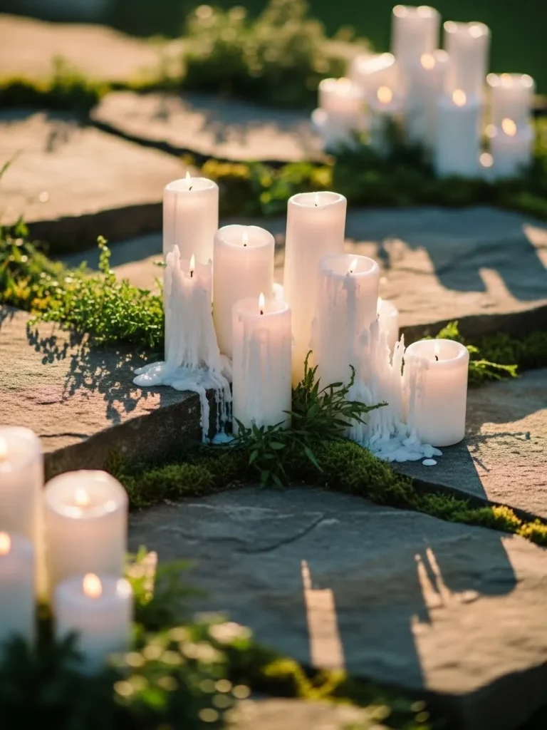 Glass candles line a stone pathway surrounded by greenery. The soft glow creates a dreamy atmosphere as the light reflects gently off the glass. The arrangement feels serene and magical.