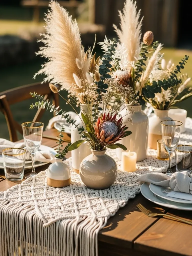 A reception table is styled with neutral ceramics, pampas grass, and textured linens. Soft beige tones and dried florals create a modern yet earthy look. The table feels calm and beautifully balanced.