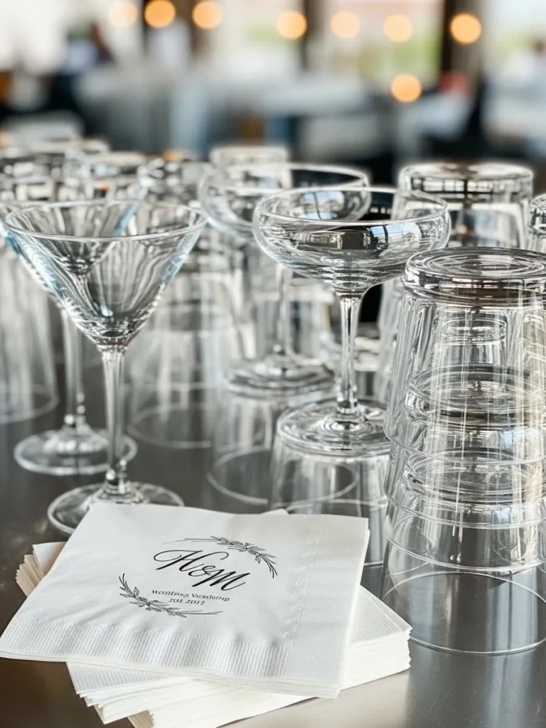 Rows of sparkling glassware are neatly arranged on a sleek bar surface with custom cocktail napkins placed nearby. The clean lines and clear glass create a polished look that feels modern and elegant. Soft background lighting adds a subtle glow that makes everything look extra inviting.