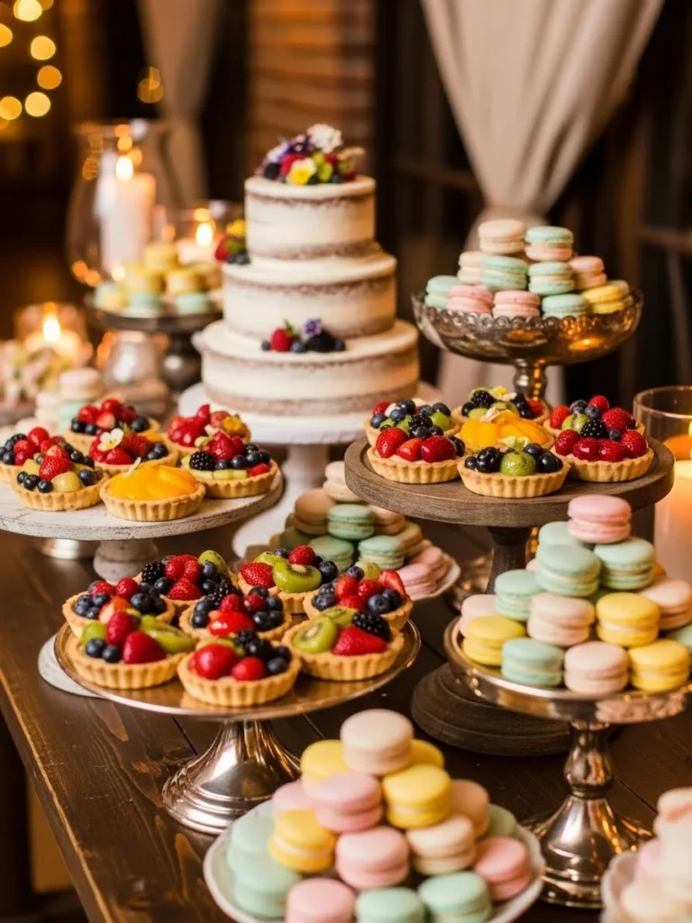 A beautifully layered dessert table features colorful mini tarts, macarons, and a small cake displayed on elegant stands. The rich tones of fresh fruit and pastel sweets pop against the warm wooden table and soft glowing lights in the background. Every detail feels playful but still polished.
