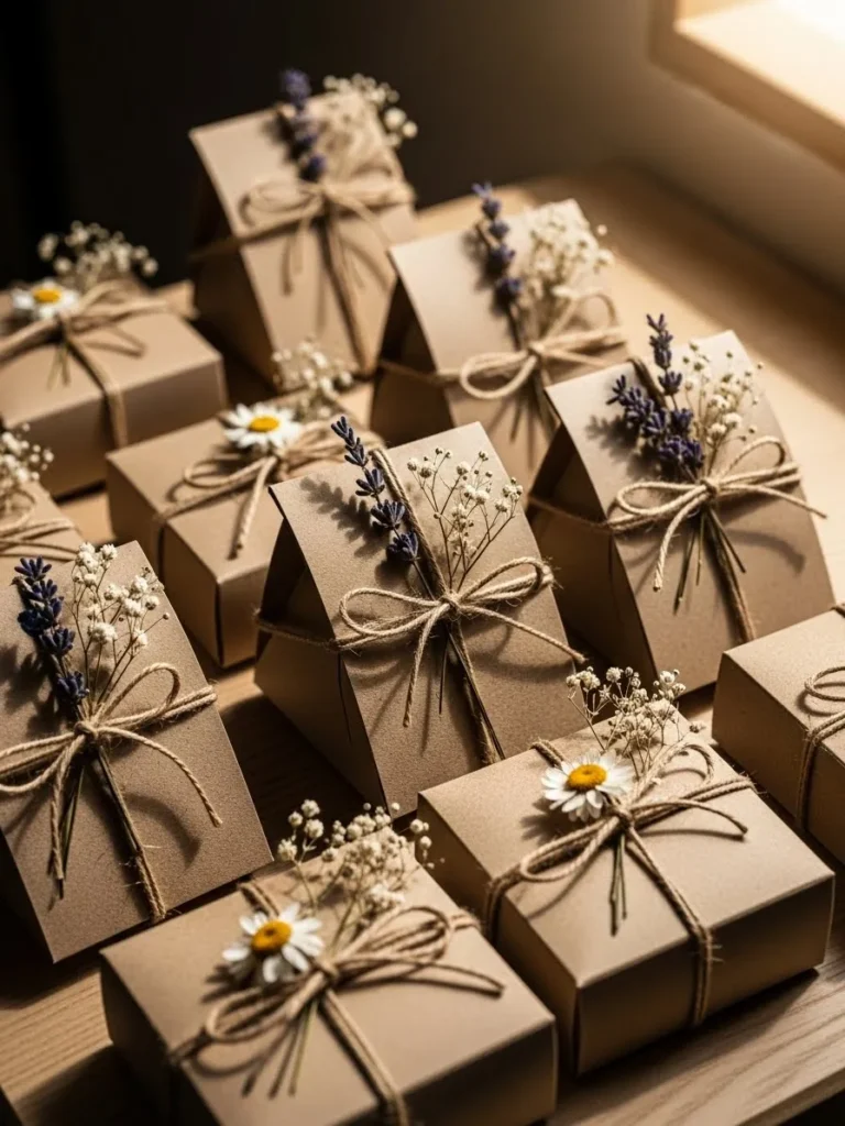 Small kraft gift boxes are stacked neatly, each tied with twine and finished with dried florals. The natural textures and soft neutral tones give the favors a handmade and heartfelt feel. Everything looks cohesive and perfectly suited for a warm summer celebration.