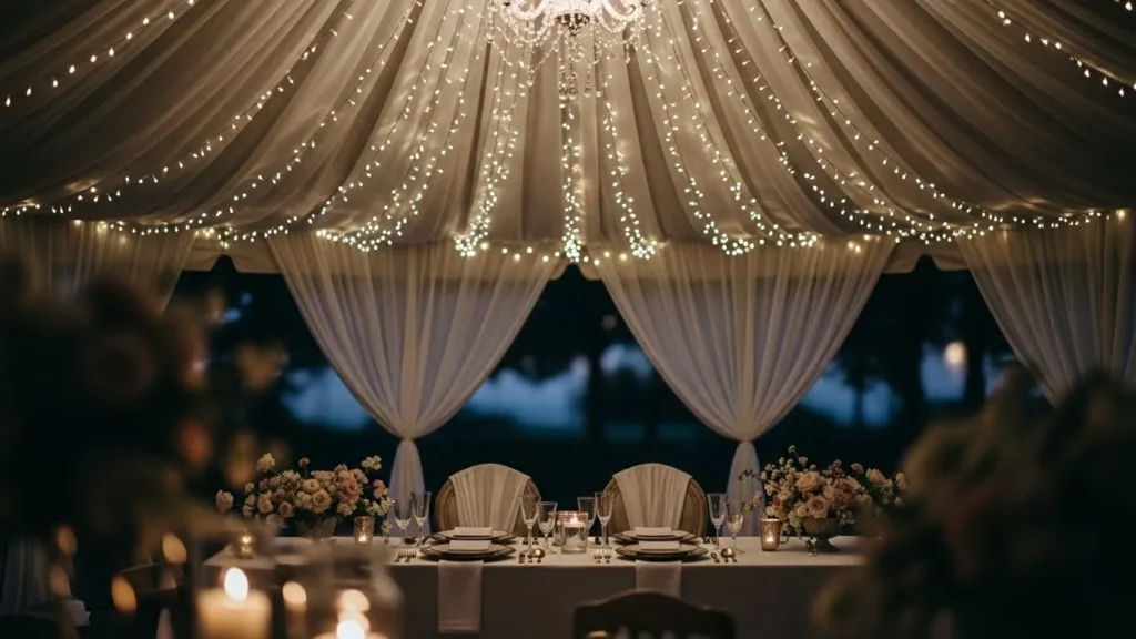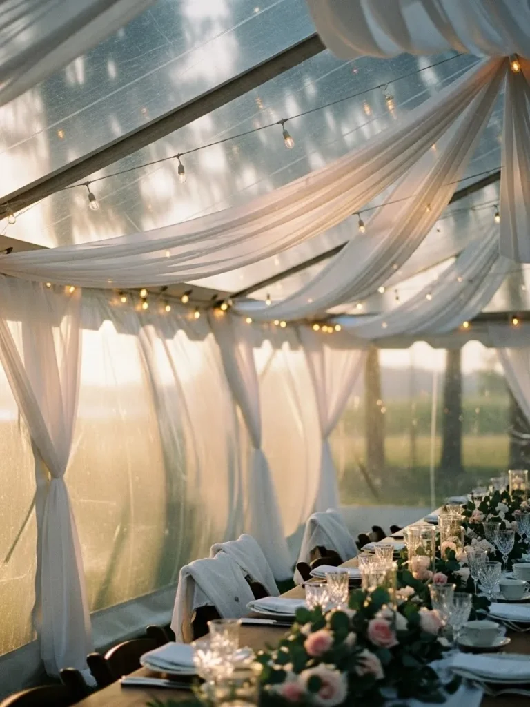 Sheer fabric is draped across the ceiling of a tent with delicate string lights woven throughout. Long tables are styled underneath, creating a glowing and romantic atmosphere as daylight fades. The soft movement of the fabric makes the space feel airy and magical.
