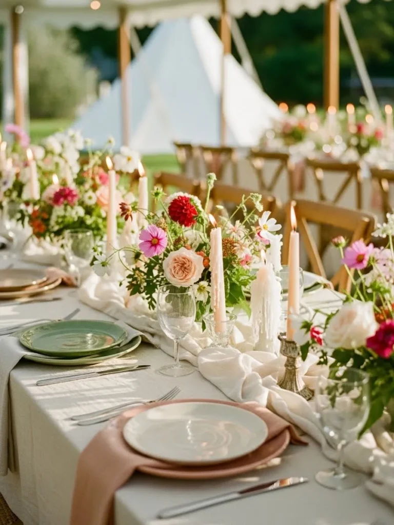 A long reception table is styled with pastel florals, taper candles, and layered place settings. Soft pinks, greens, and creams blend beautifully with natural wood chairs and linen runners. The look feels lush and elegant without feeling overly formal.