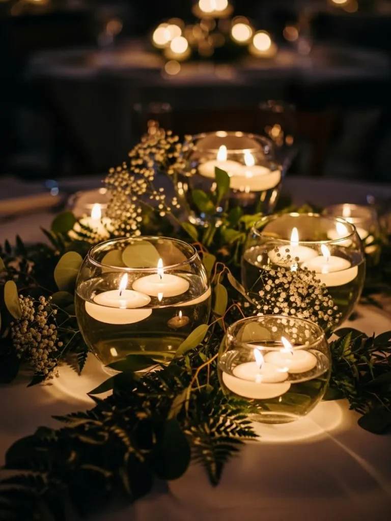 Glass candle holders filled with floating candles are surrounded by lush greenery and delicate florals. The soft candlelight reflects off the glass, creating a warm and intimate glow across the table. The setting feels cozy and romantic as the light flickers gently.