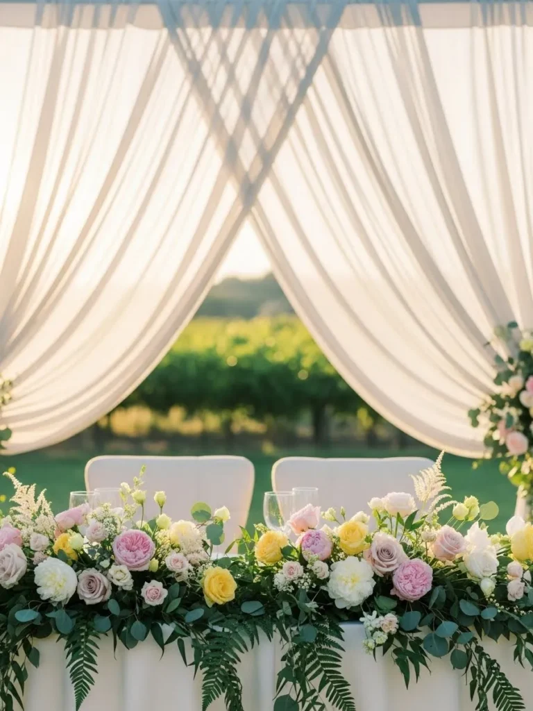 Sheer white fabric is draped gracefully behind the reception area, framing a floral arrangement filled with soft pastels and fresh greenery. The open view beyond adds natural light and a breezy outdoor feel. Everything looks airy and beautifully balanced.
