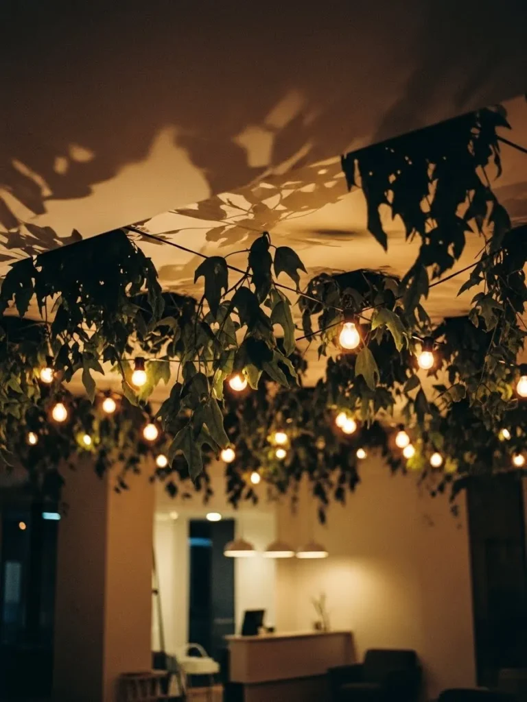 Lush greenery is suspended from the ceiling with warm string lights woven throughout. The leaves hang naturally, creating a canopy effect above the reception space. The lighting casts a golden glow that feels intimate and inviting.