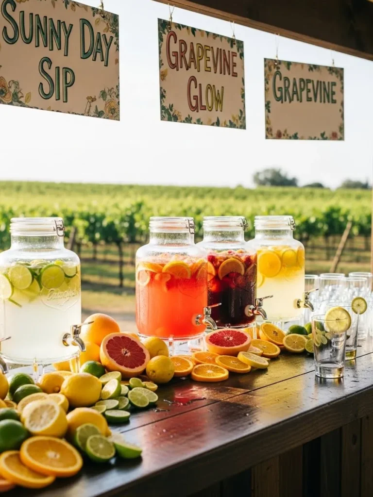 A cheerful drink station features large glass dispensers filled with colorful citrus drinks. Sliced lemons, oranges, and limes are displayed nearby, adding freshness and color. Handwritten signs give the setup a relaxed and personal touch.