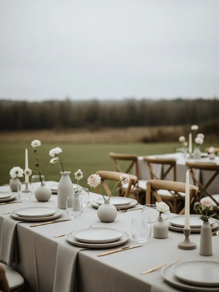 A long reception table is dressed in crisp neutral linens with simple white plates and delicate glassware. Minimal floral accents and natural textures keep the look calm and refined. The open landscape in the background adds an airy outdoor feel that feels effortless and serene.