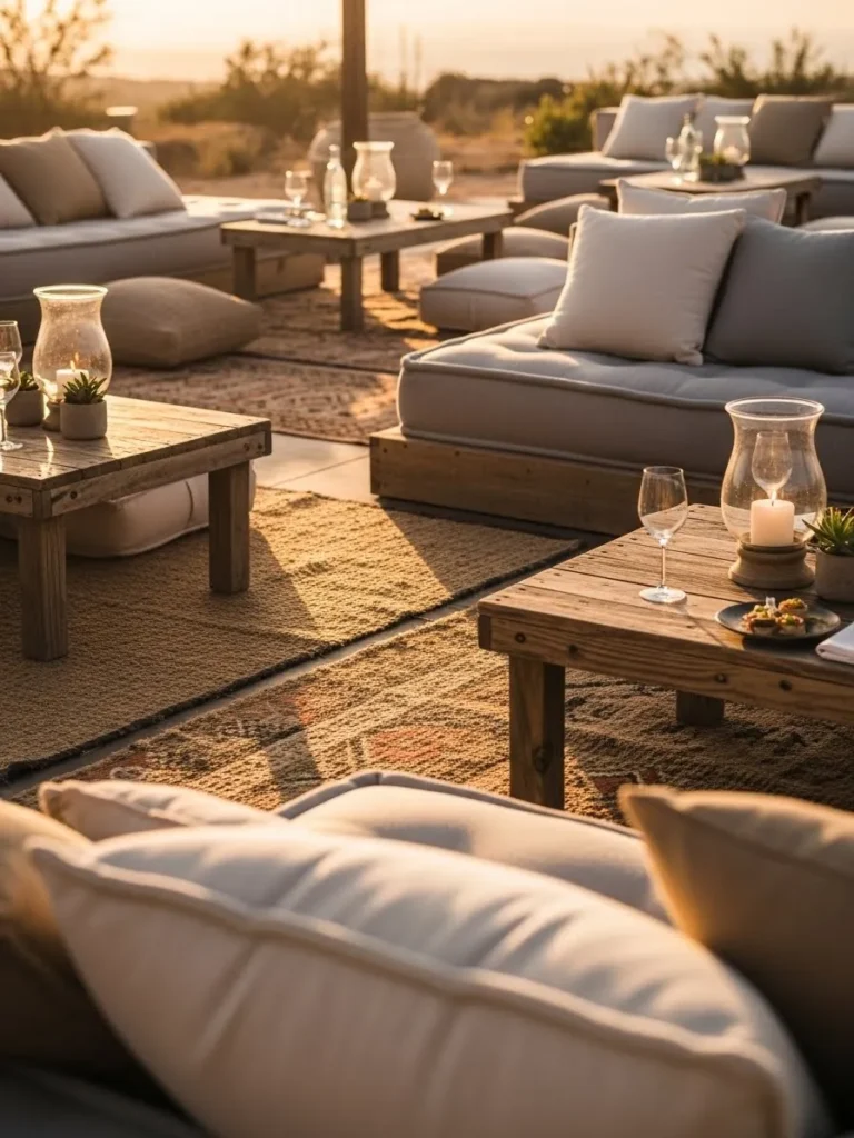 Plush cushioned seating is arranged in a relaxed outdoor lounge layout with low wooden tables and soft pillows. Lanterns and candles add warmth as the sun sets, creating an inviting space for guests to unwind. The textures feel layered and comfortable without losing that polished wedding look.