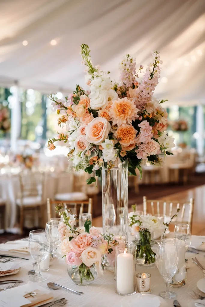 This reception table features a tall clear glass vase overflowing with soft blush roses, peach garden blooms, and airy white florals layered with fresh greenery. Smaller matching arrangements sit around the base, paired with glowing pillar candles, delicate votives, and crisp neutral linens. The overall look feels light and romantic, especially under the draped tent ceiling and warm natural light that makes every petal glow.