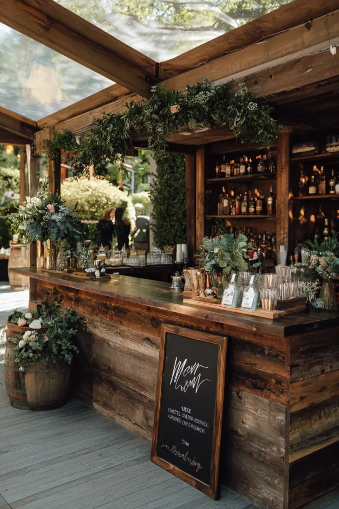 This open air wooden bar is styled with rich natural textures and lush greenery woven along the beams and bar front. Shelves filled with glass bottles create a warm inviting backdrop, while eucalyptus arrangements, soft white blooms, and simple glassware keep everything feeling fresh and seasonal. A handwritten chalkboard menu adds a personal touch, and the surrounding greenery makes the bar feel like part of the garden itself.