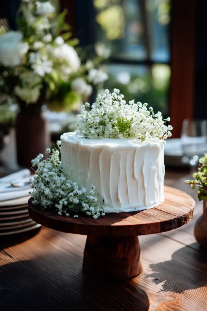 This simple white wedding cake is finished with softly textured frosting and topped with a cloud of fresh baby’s breath. It sits on a rustic wooden cake stand that adds warmth and contrast to the clean design. A few extra sprigs of tiny white blooms rest beside the cake, while natural wood tones and soft light create a calm spring ready setting.