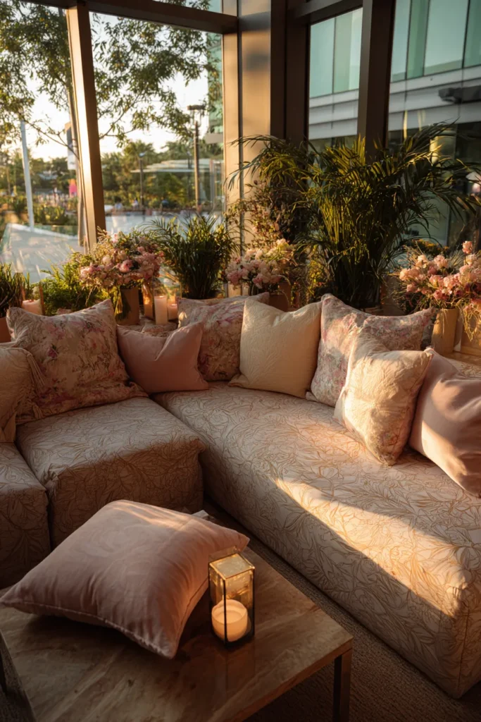 This reception lounge features soft upholstered seating layered with blush and floral patterned pillows in gentle spring tones. Low wooden tables hold glowing candles in glass lanterns, while potted greenery and pastel florals line the windows behind the seating. Warm sunlight pours in through the glass walls, giving the entire space a golden glow that feels relaxed and welcoming.