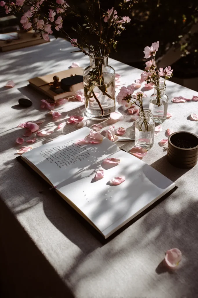 This guestbook table is styled with simple glass bottles holding delicate cherry blossom branches, scattered blush petals, and soft linen fabric beneath. An open guestbook rests at the center, surrounded by natural wood accents and small details that feel thoughtfully placed. Sunlight filters across the table, creating gentle shadows that make the blossoms and petals feel even more romantic and alive.