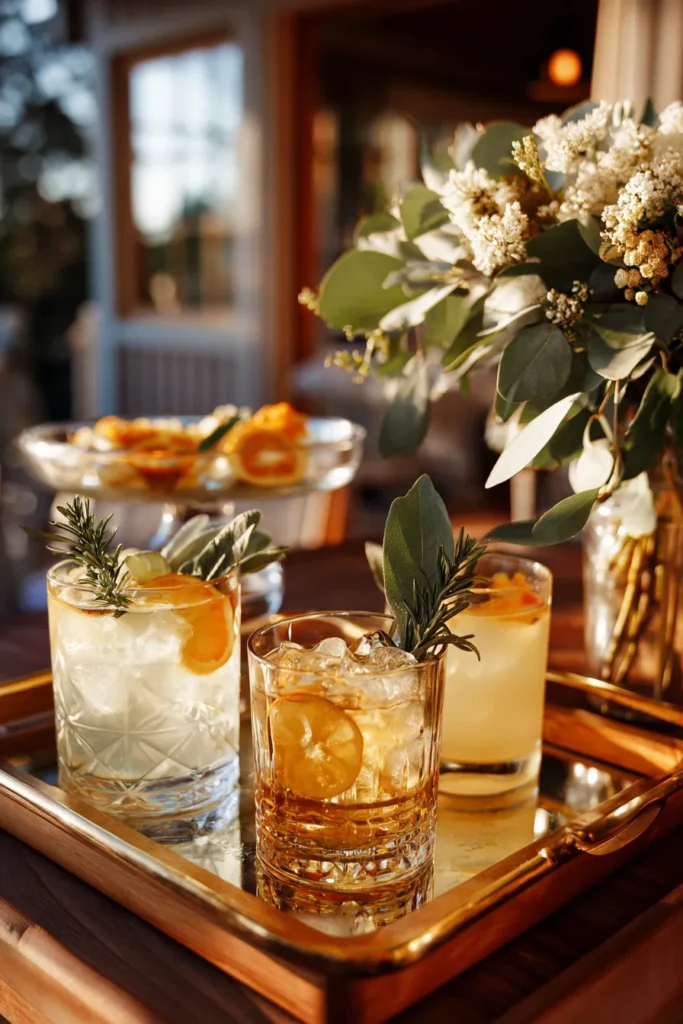 This drink display features crystal glasses filled with light golden cocktails garnished with citrus slices and fresh rosemary. The drinks are arranged on a mirrored tray that reflects the warm light, paired with soft greenery and white florals nearby. Clear ice cubes and simple glassware keep the look polished while still feeling relaxed and seasonal.