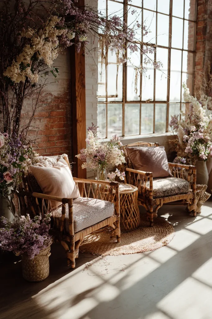This cozy lounge corner features woven rattan chairs with soft neutral cushions, set against tall windows that let sunlight pour across the floor. Delicate spring blooms in blush and ivory surround the seating, arranged in baskets and vases that soften the exposed brick and wood textures. Natural fiber rugs and airy florals create a calm inviting spot that feels tucked away but still part of the celebration.