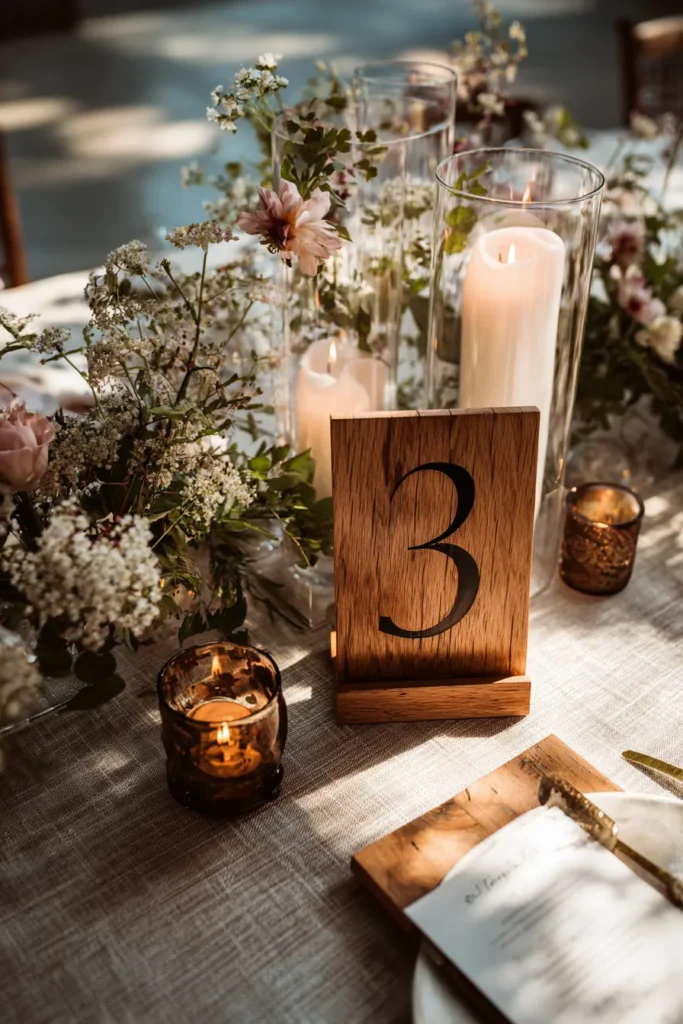 This table setting features a warm wooden table number displayed on a simple stand, surrounded by soft candlelight and loose spring florals. Clear glass cylinder candles glow gently beside blush blooms, baby’s breath, and airy greenery arranged in an effortless low centerpiece. Neutral linens and textured glass votives complete the look, keeping everything cohesive and softly romantic.