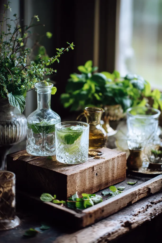 This drink station is styled with rustic wooden risers, clear glass decanters, and cut crystal glasses filled with fresh herbs and citrus. Sprigs of mint spill casually across the wood surface, while leafy greenery and small plants frame the setup in soft natural layers. The mix of textures from aged wood to gleaming glass gives the whole station an earthy yet refined spring look.