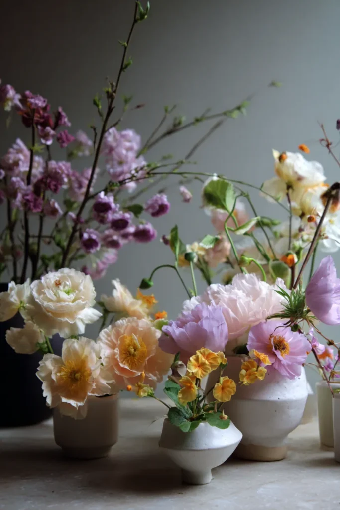 This floral display features a collection of small ceramic vases filled with airy spring blooms in soft peach lavender blush and buttery yellow tones. Delicate petals and winding stems reach outward in a relaxed organic way, creating movement and texture without feeling crowded. The neutral vessels keep the focus on the flowers, while the muted background lets every color and shape stand out beautifully.