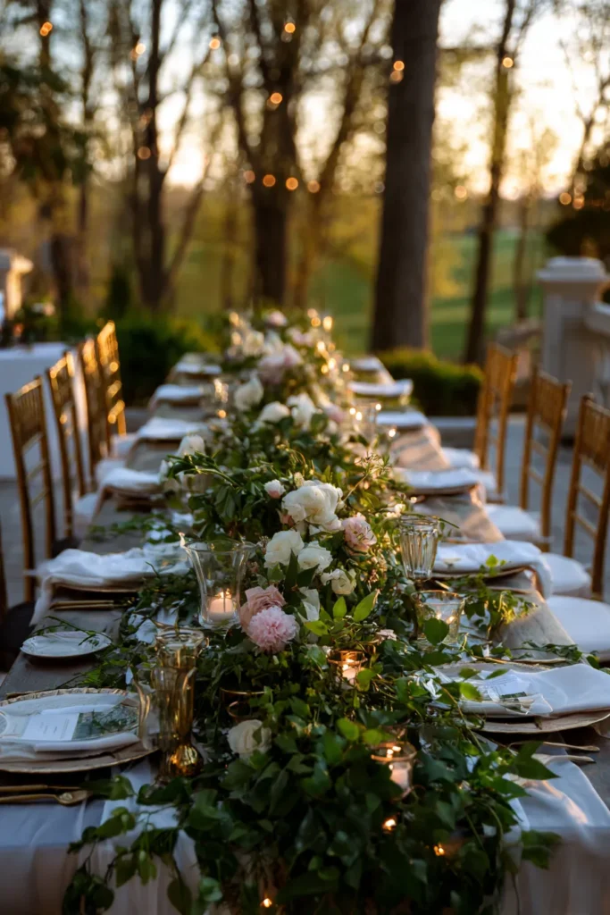 This long reception table is styled with flowing greenery runners, soft blush and ivory blooms, and glowing candlelight woven throughout. Delicate fairy lights twinkle above, while classic wooden chairs and neutral linens keep the look grounded and elegant. The surrounding trees and fading daylight create a romantic outdoor backdrop that feels calm and intimate as evening settles in.