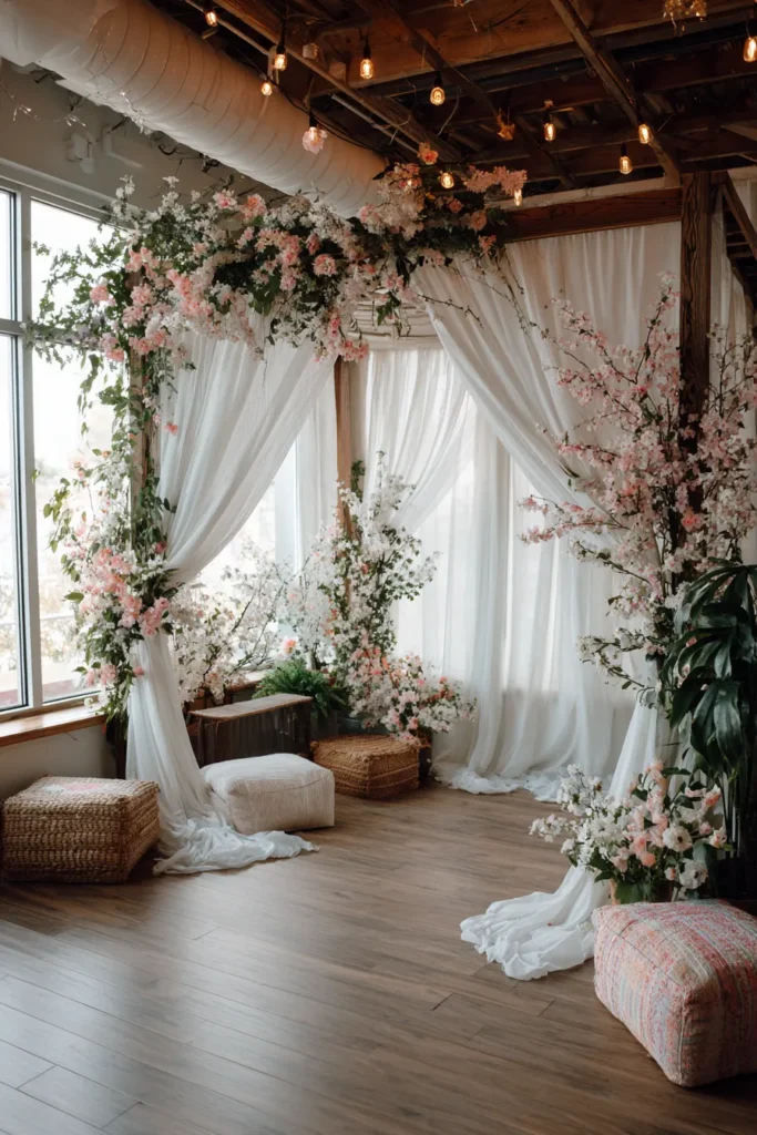 This reception photo area features flowing white drapery framed by cascading blush and ivory spring blooms. Delicate branches and floral clusters soften the wooden beams, while woven poufs and cozy floor cushions create a relaxed seating moment beneath warm string lights. Natural textures and airy fabrics give the space a light romantic feel that feels both styled and inviting.