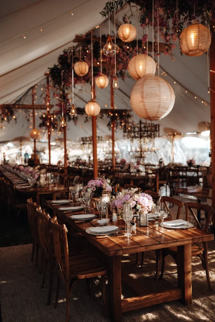 This reception space features long wooden tables dressed with soft floral centerpieces in blush and lavender tones, surrounded by warm wood chairs and glowing candlelight. Overhead, paper lanterns and hanging bulbs are layered among greenery and florals, creating a cozy canopy beneath the tented ceiling. Clear glassware and simple place settings keep the look balanced while the lighting adds a dreamy evening glow.