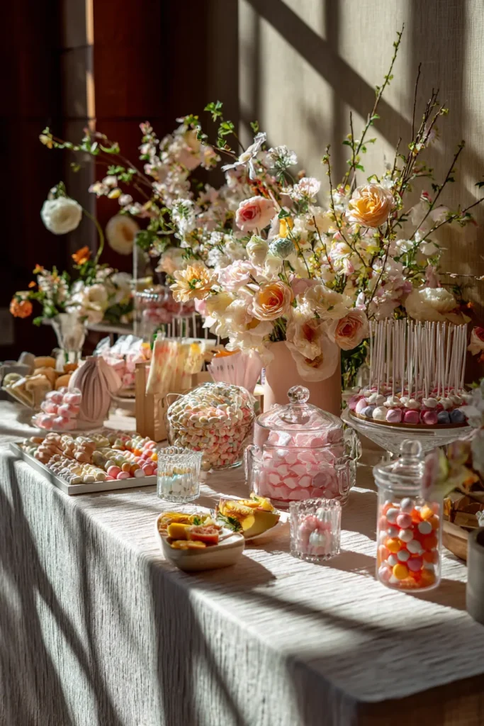 This dessert table is overflowing with soft spring charm, featuring glass jars filled with pastel candies, delicate cookies, and dainty sweets arranged on a textured linen tablecloth. Blush and cream florals rise from ceramic vases, mixing roses, ranunculus, and airy branches that catch the sunlight beautifully. Cake pops, macarons, and bite sized treats are layered at different heights, giving the whole setup a playful yet polished look that feels straight out of a spring garden party.