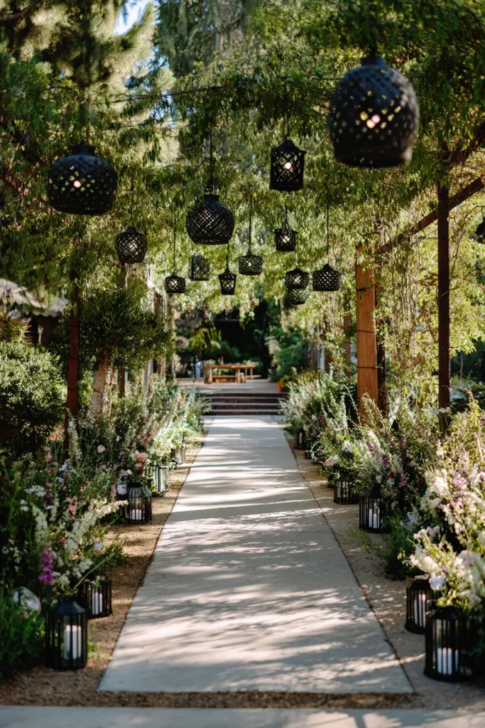 This reception walkway is lined with lush greenery and soft pastel flowers spilling along both sides of a clean stone path. Black lanterns with glowing candles sit at regular intervals, creating a warm rhythm that guides guests forward. Overhead, hanging lanterns are suspended from a leafy canopy, casting gentle light through the trees and giving the whole space a magical garden tunnel feel.