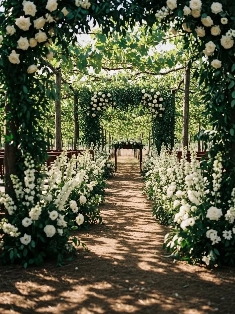 The ceremony aisle is framed with white flowers and greenery creating a soft pathway through a garden setting. Overhead foliage filters the light and adds depth to the space. The natural textures make everything feel intimate and romantic.