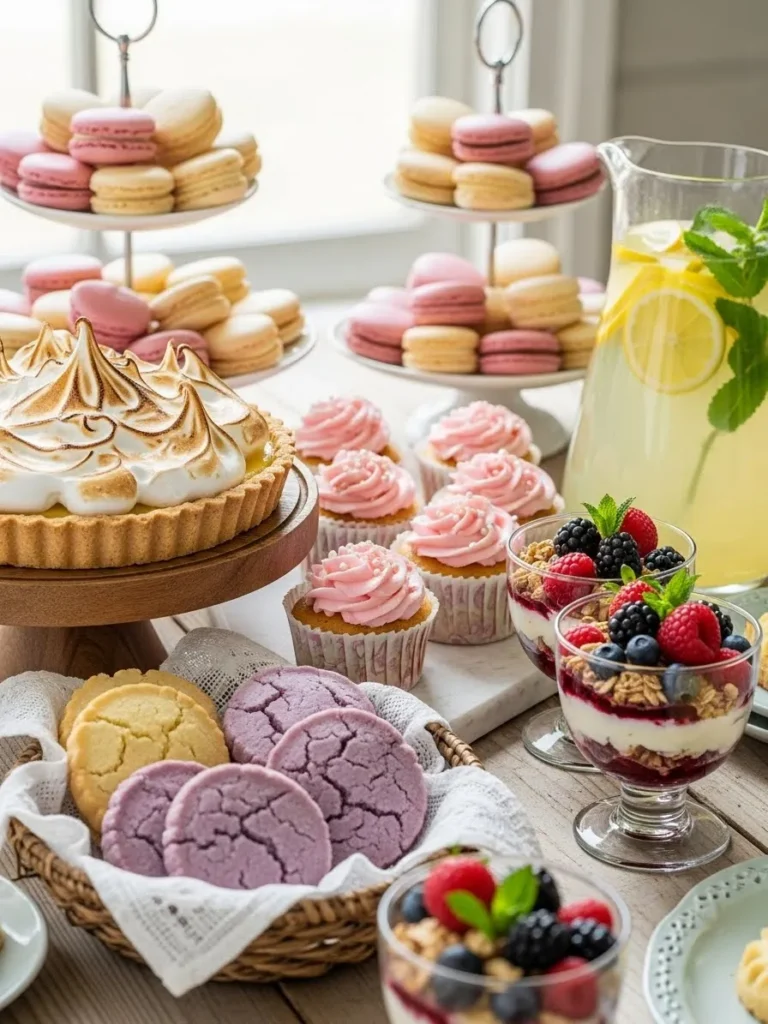The dessert table is filled with pastel macarons, cupcakes with swirled frosting, fruit tarts, and layered sweets displayed on elegant stands. Soft pinks, creams, and muted yellows dominate the scene, with fresh berries adding pops of natural color. Everything looks light, playful, and perfectly styled for a warm summer celebration.