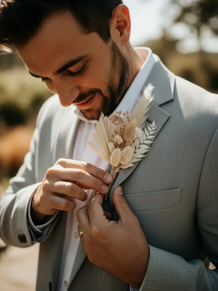The groom wears a light grey suit paired with a soft neutral shirt and a delicate floral boutonniere. The flowers feature muted tones that blend seamlessly with the suit. The look feels polished while still relaxed enough for an outdoor setting.