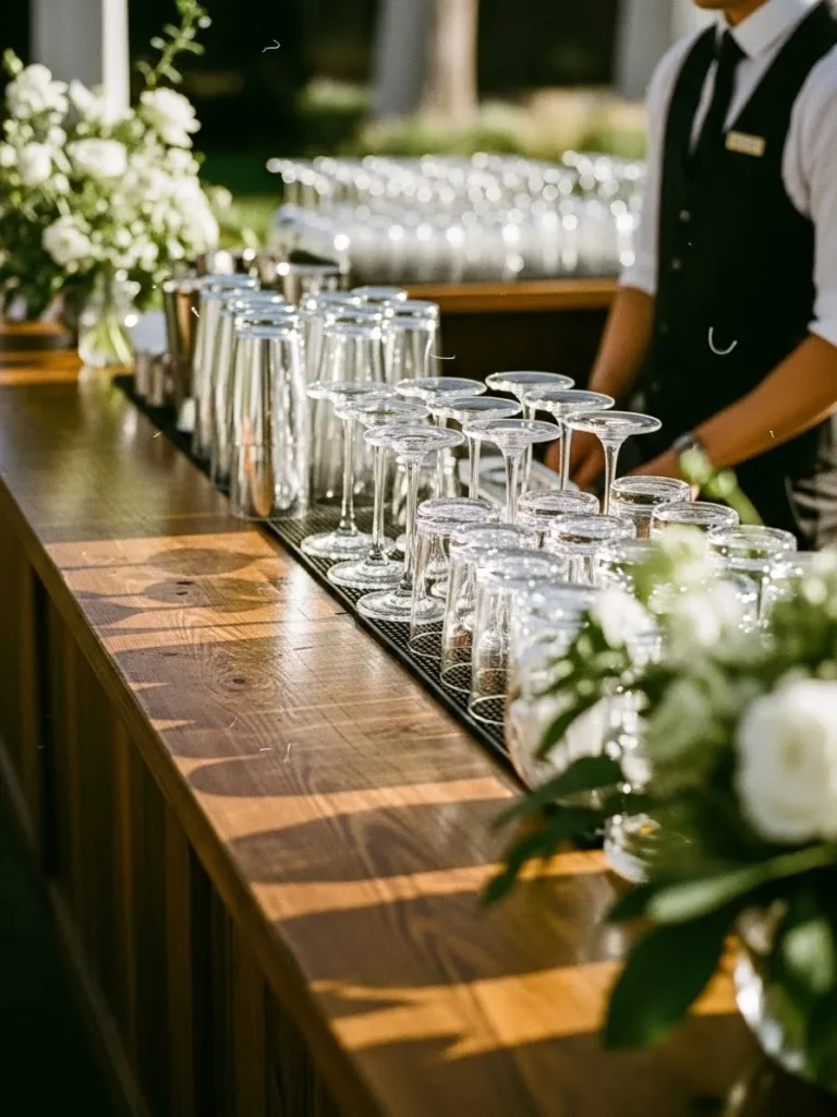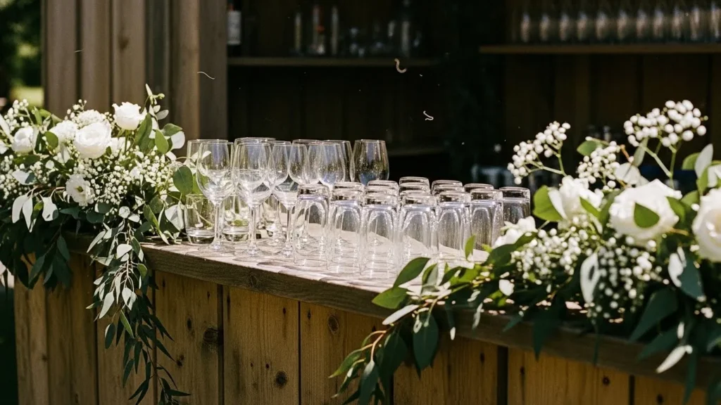 The bar setup features rows of clean glassware arranged neatly on a warm wooden counter. Greenery accents soften the look and tie it into the overall wedding palette. The styling feels fresh, organized, and inviting.