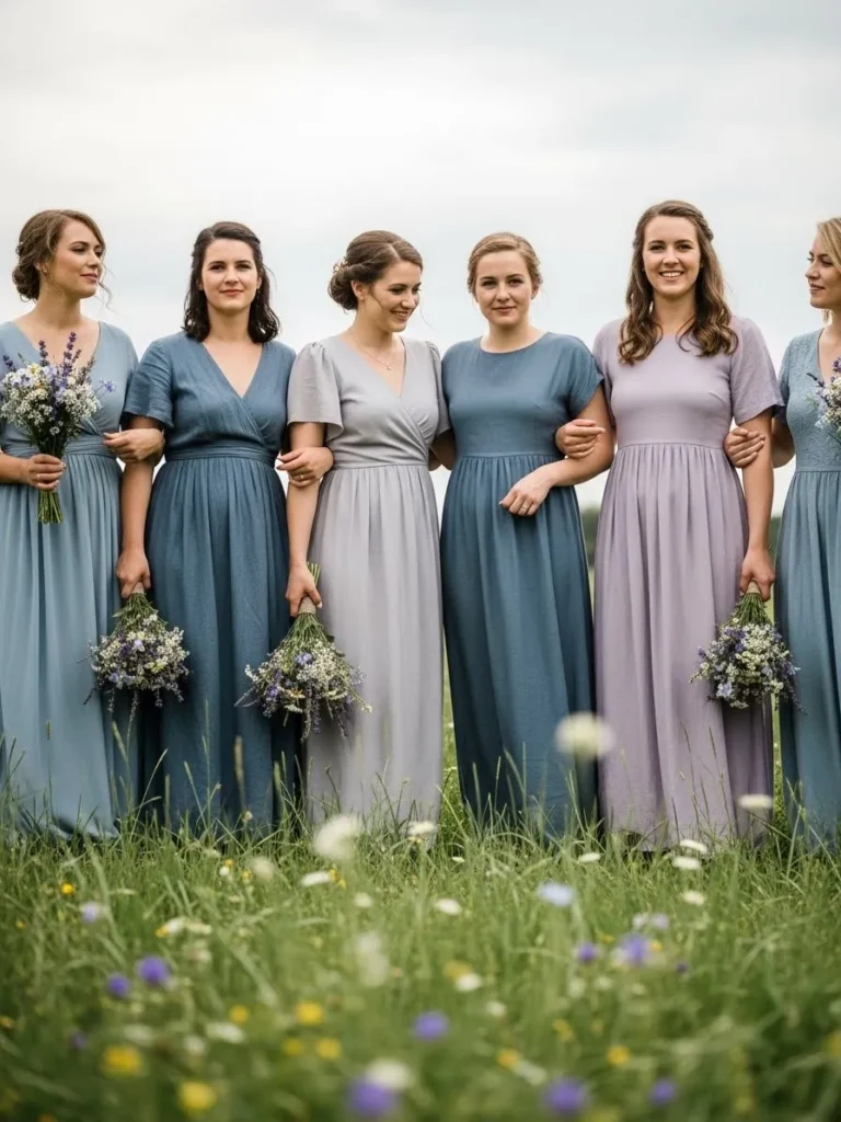 A group of bridesmaids stands together in flowing dresses in shades of dusty blue, soft lavender, and muted gray. Each dress has a slightly different cut, which adds texture and movement. The wildflower setting makes the colors feel even softer and more romantic.