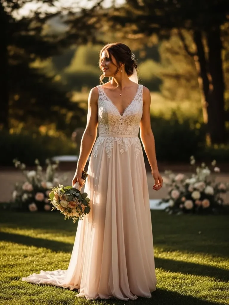 I love how this look feels warm and effortless at the same time. The blush shade glows in the golden light and feels softer than classic white. It has that dreamy summer romance feel that looks stunning in outdoor settings and photographs so beautifully without feeling overdone.