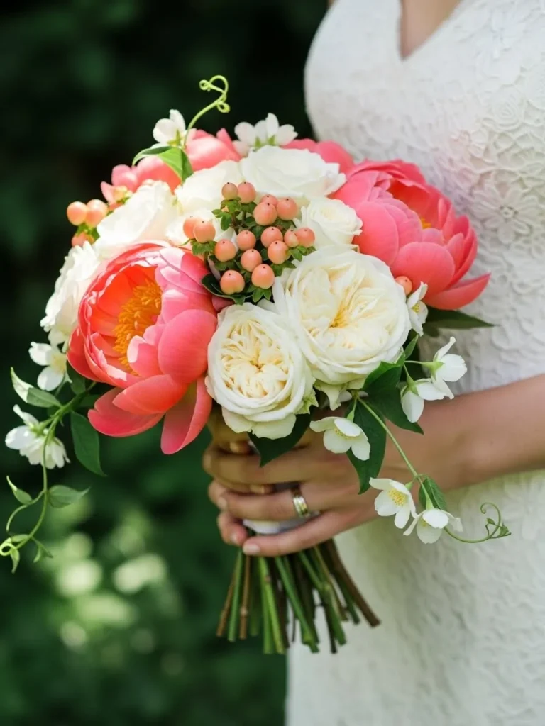 The bouquet features coral peonies, blush roses, and creamy white blooms mixed with fresh greenery. The colors are vibrant but still soft, with natural textures and loose stems. It feels fresh and joyful without looking overly styled.