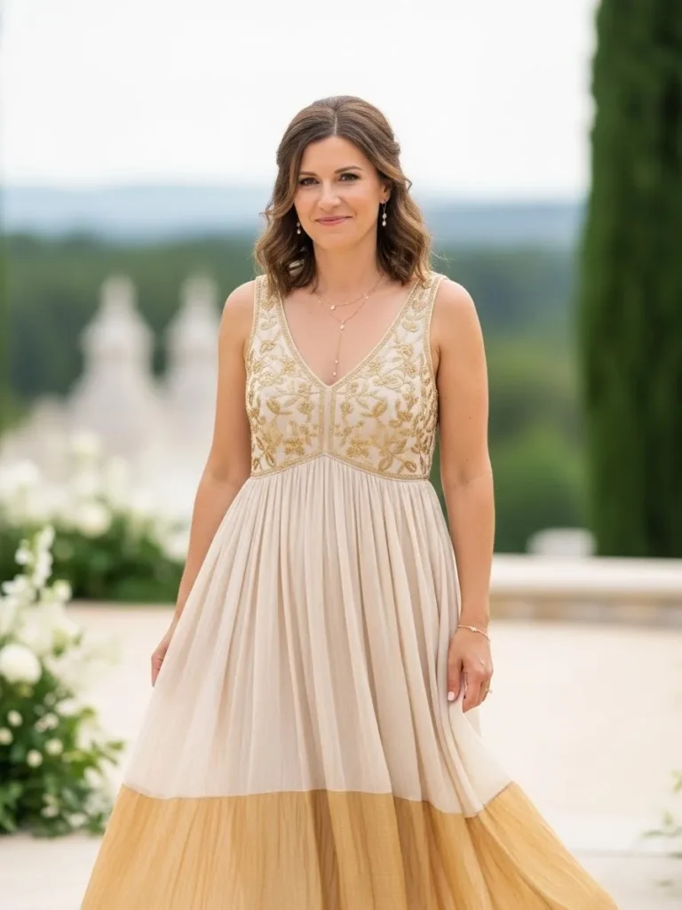 The bride wears a flowing dress with a champagne bodice and a soft layered skirt in warm cream and muted gold. The fabric moves gently and catches the light in a subtle way. The neckline and texture add just enough detail without feeling heavy.