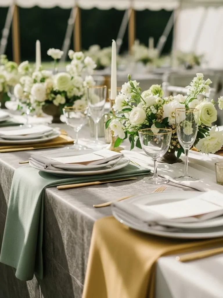 The tablescape features layered linens in soft sage green and warm cream tones paired with white floral arrangements and simple glassware. Neutral place settings keep everything light while subtle greenery adds freshness. The overall look feels airy and calm, perfect for an outdoor summer reception.