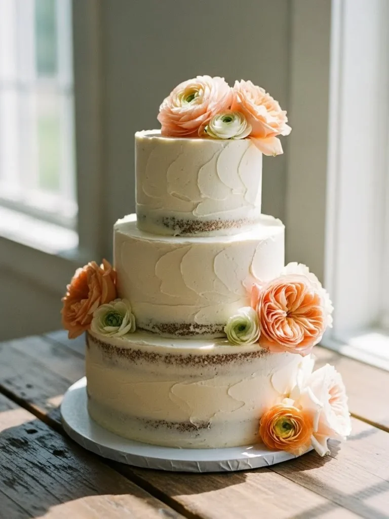 The tiered wedding cake is decorated with smooth buttercream and soft peach flowers placed delicately around each layer. The neutral base allows the florals to stand out without overpowering the design. Everything feels light, elegant, and summery.